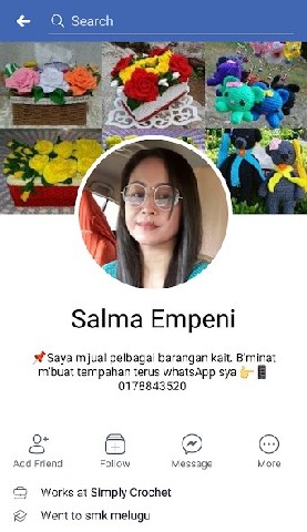 Pn. Salma Empeni merupakan seorang suri rumah sepenuh masa yang berbakat dalam membuat kraftangan crochet. Sebagai seorang suri rumah,beliau menggunakan Facebook sebagai platform untuk menjual produk kraftangan crochet beliau. Beliau juga turut membuat kraftangan crochet mengikut kreativiti dan permintaan pelanggan. Untuk sebarang pertanyaan atau tempahan, beliau boleh dihubungi di talian 017-8843520 atau Facebook Salma Empeni.