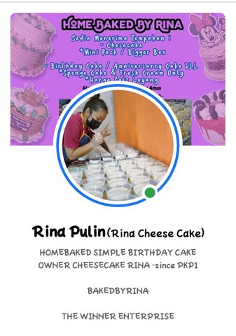 Pn Rina merupakan seorang suri rumah sepenuh masa yang berminat dan berbakat dalam pembuatan kek harijadi, kek bajet dan kek cheese. Beliau menjalankan perniagaan sepenuhnya dari rumah dengan dibantu oleh suami beliau yang melakukan kerja-kerja penghantaran kek (COD) mengikut kawasan permintaan pelanggan. Pelanggan yang berminat untuk menempah dan membeli kek hasil buatan beliau boleh menghubunginya di talian 013-7970522 atau Facebook Rina Pulin (Rina Cheese Cake).