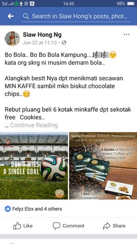 Pn Ng Siaw Hong berminat dalam penjualan barangan secara online yang menggunakan Facebook dan Whatsapp sebagai platform. Beliau merupakan agen sah Sahajidah Hai-O Merketing Sdn Bhd bermula dari 24 Mac 2016 sehingga sekarang yang menjual pelbagai produk kesihatan dan penjagaan diri seperti MinKaffe, MinCha, Marine Essence, Herba Maharani, BioSeleza dan lain-lain lagi.