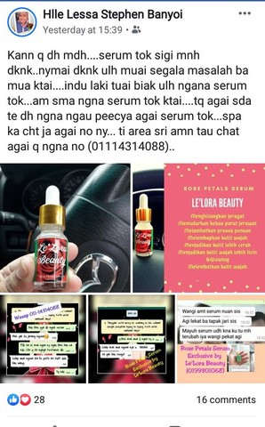 Pn. Hellesa anak Stephen Banyoi berminat dalam penjualan produk secara online dan merupakan ejen dropship bagi produk kecantikkan yang dihasilkan oleh usahawan tempatan iaitu Le’Lora Beauty. Produk kecantikkan yang diiklankan oleh beliau dalam media sosial telah mendapat permintaan yang memberangsangkan daripada penduduk sekitar. Untuk maklumat lanjut, beliau boleh dihubungi ditalian 0111-4314088 atau Facebook : Hlle Lessa Stephen Banyoi.