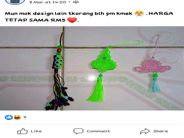 Cik Rebeka Jabai anak Jim amat berminat dan berbakat dalam membuat kraftangan macramé. Beliau sering melayari laman web seperti Youtube untuk mempelajari pembuatan pelbagai jenis macramé. Untuk sebarang tempahan, beliau boleh dihubungi di talian 017-8566104 ataupun ke PI Melugu untuk sebarang pertanyaan.