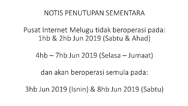 Berikut adalah notis penutupan Pusat Internet bersempena Cuti Perayaan Hari Gawai Dayak dan Hari Raya Aidilfitri 2019