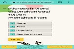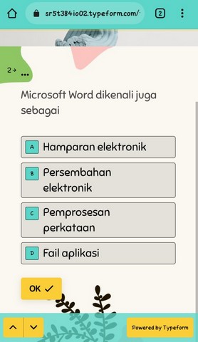 Dalam kuiz ini, peserta diberi link untuk mengakses beberapa soalan berkaitan Word yang terdapat dalam Typeform dan mereka dikehendaki untuk menjawab soalan dalam bentuk objektif. Peserta diwajibkan untuk menjawab semua soalan dan markah akan dipaparkan setelah mereka menyelesaikan tugasan.