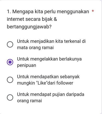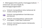 Google Form terdiri daripada pelbagai jenis soalan, boleh memasukkan gambar, video dan seksyen serta dapat menarik dan melepas seksyen soalan. Dalam kuiz ini, peserta dikehendaki untuk mendaftar butiran diri untuk mengetahui jumlah responden yang telah menjawab kuiz ini. Peserta diwajibkan untuk menjawab kesemua soalan berkaitan Klik Dengan Bijak dan markah akan dipaparkan selepas peserta selesai menjawab semua soalan yang dinyatakan.