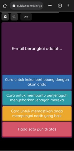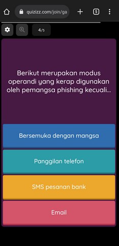 Kuiz yang telah disediakan juga dapat dikongsi dengan sesiapa sahaja tanpa perlu mendaftar akaun untuk menjawab kuiz berkenaan. Dalam kuiz ini, terdapat peserta dikehendaki untuk mendaftar nama dan menjawab kesemua soalan dalam berkaitan memancing data / phising yang berbentuk objektif. Markah akan dipaparkan setelah mereka menyelesaikan tugasan.