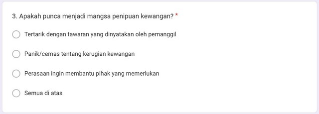 Dalam kuiz ini, peserta dikehendaki untuk mendaftar butiran diri untuk mengetahui jumlah responden yang telah menjawab kuiz ini. Peserta diwajibkan untuk menjawab kesemua soalan berkaitan penipuan kewangan yang merangkumi maksud, punca dan Tindakan yang perlu diambil daripada menjadi mangsa penipuan kewangan. Jumlah markah akan dipaparkan selepas peserta selesai menjawab semua soalan yang dinyatakan.