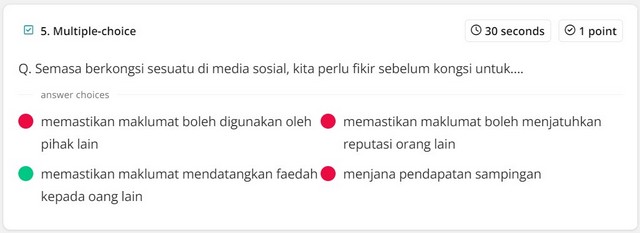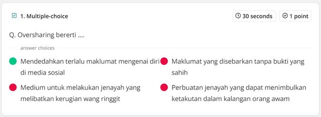 Dalam kuiz ini, peserta terpilih diminta untuk membuka link yang diberi dan mendaftar nama mereka. Para peserta dikehendaki untuk menjawab kesemua soalan berkaitan terlebih kongsi iaitu maksud, risiko dan prinsip asas menangani sikap terlebih kongsi. Jumlah mmarkah akan dipaparkan setelah mereka menyelesaikan setiap tugasan.