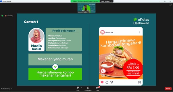 18 Ogos 2023 | Aktiviti TerkiniPada 17 Ogos 2023, salah seorang usahawan dari Pusat Ekonomi Digital (PEDi) Melugu telah menyertai Bengkel Pemasaran Digital eKelas Usahawan melalui platform Zoom Meeting. Bengkel anjuran Maxis eKelas ini diadakan bertujuan untuk menerangkan mengenai strategi pemasaran digital kepada para usahawan. Dalam program ini, En. Wan Luqman Hakim yang merupakan trainer dari Satu Creative telah menerangkan mengenai proses pemasaran digital yang dapat menarik minat pelanggan iaitu mengenali pelanggan, mereka kandungan, implimentasi dan pemantauan dan penilaian.