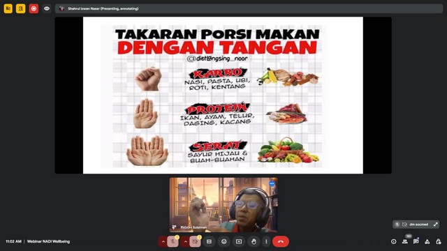 Sesi webinar kali ini telah dikongsi oleh En. Hj Ridzoni Hj Sulaiman yang merupakan konsultan dietitian. Dalam sesi perkongsian ini, beliau telah menjelaskan mengenai faktor boleh dan tidak boleh diubah, kesan buruk obesiti, punca diet tidak berjaya, 7 jenis sarapan berbeza, takaran porsi makanan dengan tangan, 7 jenis kekacang berbeza, 7 jenis sayuran dan buahan berbeza warna serta amalan pemakanan yang sihat.