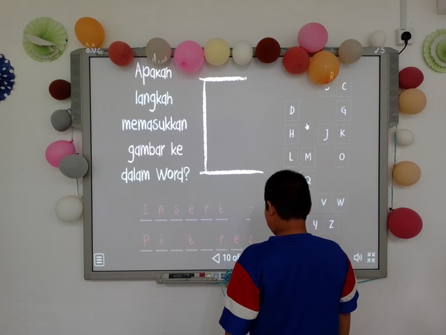 Dalam kelas ini, peserta dikehendaki untuk mengenalpasti dan melabel perkataan yang betul tentang Microsoft Word menggunakan template Hangman di laman web Wordwall. Peserta diminta untuk maju ke hadapan dan memadankan perkataan berkenaan di Smartboard. Markah akan dikira berdasarkan jumlah perkataan yang ditempatkan bagi melengkapkan ayat yang betul.