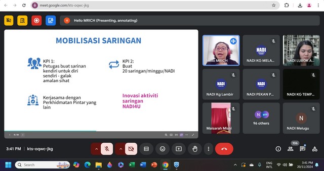 21 November 2024 | Aktiviti TerkiniPada 20 November 2024, Pusat Sebaran Maklumat Nasional (NADI) Melugu telah menyertai sesi Webiner NADI Kesejahteraan Kendiri yang diadakan menggunakan platform Google Meet. Webiner yang diadakan pada setiap petang hari Rabu ini diadakan bertujuan untuk mendapatkan info terbaru, amalan terbaik saringan dan perkongsian-perkongsian yang lain.