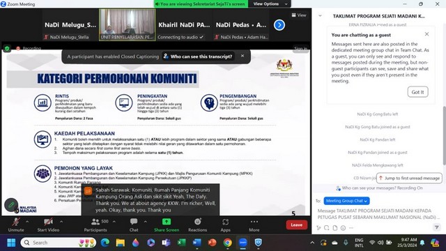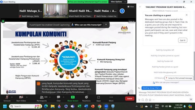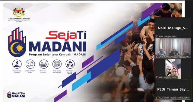 26 Mac 2024 | Aktiviti TerkiniPada 25 Mac 2024, Pusat Sebaran Maklumat Nasional (NADI) Melugu telah menyertai sesi taklimat secara maya mengenai SejaTi MADANI yang diadakan oleh pihak Unit Penyelarasan Pelaksanaan (ICU) dari Jabatan Perdana Menteri melalui aplikasi Zoom Meeting. Taklimat ini bertujuan untuk menerangkan kepada para petugas NADI mengenai program SejaTi MADANI untuk memperkasa aktiviti ekonomi komuniti dengan pemberian geran bagi pelaksanaan program-program sektor tumpuan.