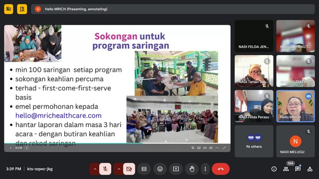 Sesi webinar ini kali ini adalah mengenai perkembangan terkini saringan yang telah dibuat oleh petugas NADI, proses untuk memperoleh sokongan keahlian percuma semasa pemeriksaan kesihatan diadakan semasa program-program, proses memohon barang saringan sekiranya telah habis digunakan dan inisiatif-inisiatif yang dapat digunakan untuk memperoleh pengguna bagi pemeriksaan kesihatan.