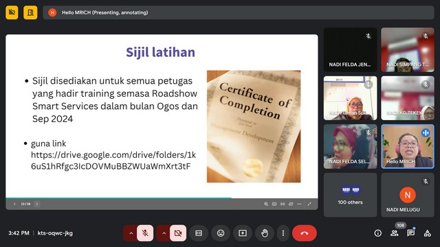 28 November 2024 | Aktiviti TerkiniPada 27 November 2024, Pusat Sebaran Maklumat Nasional (NADI) Melugu telah menyertai sesi Webiner NADI Kesejahteraan Kendiri yang diadakan menggunakan platform Google Meet. Webiner yang diadakan pada setiap petang hari Rabu ini diadakan bertujuan untuk mendapatkan info terbaru, amalan terbaik saringan dan perkongsian-perkongsian yang lain.