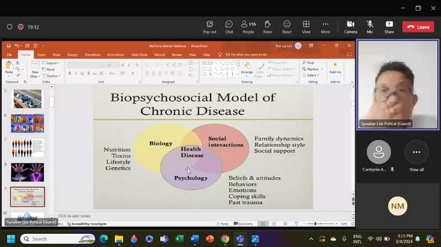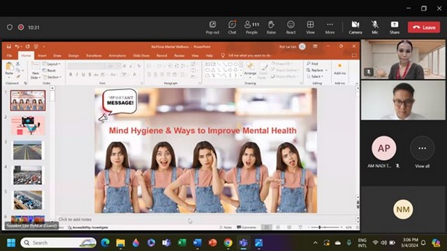 4 April 2024 | Aktiviti TerkiniPada 3 April 2024, Pusat Sebaran Maklumat Nasional (NADI) Melugu telah menyertai sesi taklimat secara maya mengenai kesihatan mental oleh En. Lim Poh Lai dari REDtone melalui aplikasi Zoom Meeting. Taklimat ini diadakan bertujuan untuk mengenalpasti tahap kesihatan mental seseorang individu dan cara untuk mengurangkan tekanan mental.