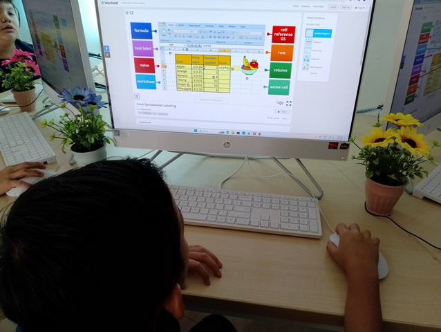 Dalam kelas ini, peserta telah diminta untuk membuka laman web Wordwall dan memilih kuiz Microsoft Excel bertajuk Excel Spreadsheet Labelling. Mereka dikehendaki untuk menjawab kuiz Microsoft Excel iaitu dengan menandakan alatan dengan nama yang betul menggunakan template Labelled Diagram. Markah akan diberikan selepas mereka selesai memadankan perkataan dan alatan berkenaan.