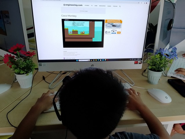 Dalam kelas ini, peserta telah bermain permainan berunsur pendidikan dalam laman web Engineering.com dengan memilih kategori STEM Game. Pelajar dikehendaki memilih permainan bertajuk Coco Monkey dimana mereka menggunakan kekunci A, W, S dan D untuk menggerakkan avatar monyet untuk mengambil pisang yang membolehkannya mara ke peringkat seterusnya. Selain itu, peserta juga digalakkan berfikir untuk menetapkan arah pointer tetikus bagi membaling kelapa supaya avatar tidak terkena bucu yang tajam ketika melompat untuk mengambil pisang di seberang blok.