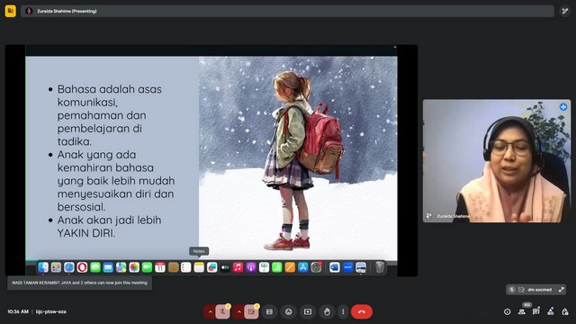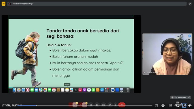 Sesi webinar kali ini telah dikongsi oleh Pn. Zuraida binti Ahmad Shahime yang merupakan Ahli Terapi Pertuturan. Dalam webinar ini, beliau telah menerangkan mengenai tanda-tanda anak bersedia dari segi bahasa, cara untuk meningkatkan sensori anak-anak, kemahiran bahasa yang membantu anak di sekolah dan intervensi awal untuk membantu perkembangan bahasa anak.