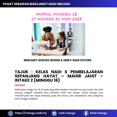 Kelas Nadi X Pembelajaran Sepanjang Hayat – Mahir Jahit – Intake 2 (Minggu 18)