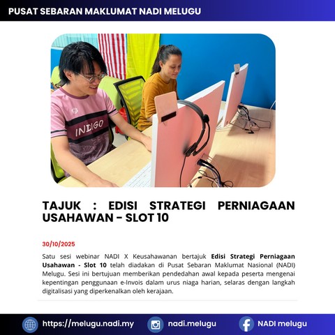 30 Oktober 2025 | Aktiviti TerkiniSatu sesi webinar NADI X Keusahawanan bertajuk Edisi Strategi Perniagaan Usahawan - Slot 10 telah diadakan di Pusat Sebaran Maklumat Nasional (NADI) Melugu. Sesi ini bertujuan memberikan pendedahan awal kepada peserta mengenai kepentingan penggunaan e-Invois dalam urus niaga harian, selaras dengan langkah digitalisasi yang diperkenalkan oleh kerajaan.