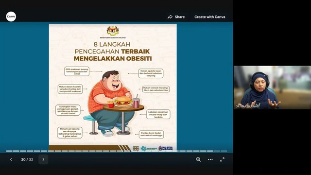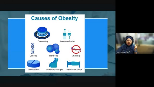 Sesi webinar kali ini telah dikongsi oleh Dr. Marzilawati Abd Rahman yang merupakan Pakar Perunding Akut Perubatan Dalaman di Hospital Kajang, Selangor. Dalam webinar ini, beliau telah menerangkan mengenai definisi penyakit dan fakta penyakit, definisi obesiti dan fakta obesiti, punca obesiti, ubatan yang boleh menambah berat badan, kesan buruk akibat obesiti, rawatan untuk mengatasi obesiti dan 8 langkah terbaik mencegah obesiti.
