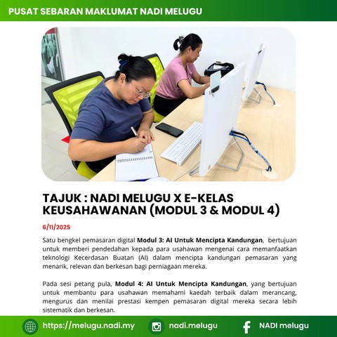 Satu bengkel pemasaran digital yang memberi tumpuan kepada Modul 3: AI Untuk Mencipta Kandungan, bengkel ini merupakan kesinambungan daripada siri latihan asas komunikasi visual yang bertujuan untuk memberi pendedahan kepada para usahawan mengenai cara memanfaatkan teknologi Kecerdasan Buatan (AI) dalam mencipta kandungan pemasaran yang menarik, relevan dan berkesan bagi perniagaan mereka.