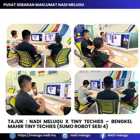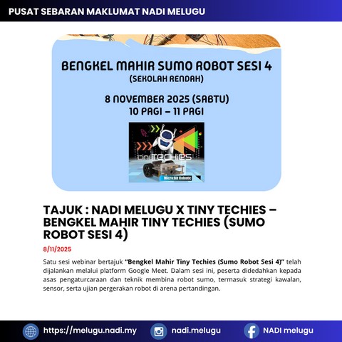 Satu sesi webinar bertajuk “Bengkel Mahir Tiny Techies (Sumo Robot Sesi 4)” telah dijalankan melalui platform Google Meet. Dalam sesi ini, peserta didedahkan kepada asas pengaturcaraan dan teknik membina robot sumo, termasuk strategi kawalan, sensor, serta ujian pergerakan robot di arena pertandingan.