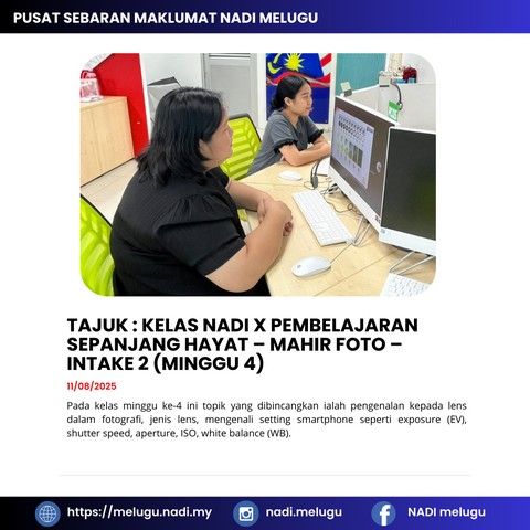 12 Ogos 2025 | Aktiviti TerkiniPada 11 Ogos 2025, seorang peserta dari Pusat Sebaran Maklumat Nasional (NADI) Melugu telah menyertai sesi Kelas NADI Mahir iaitu Mahir Foto yang diadakan menggunakan platform Google Meet.