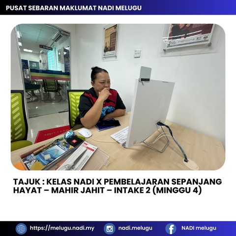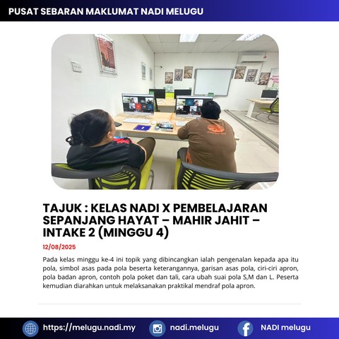 13 Ogos 2025 | Aktiviti TerkiniPada 12 Ogos 2025, dua orang peserta dari Pusat Sebaran Maklumat Nasional (NADI) Melugu telah menyertai sesi Kelas NADI Mahir iaitu Mahir Jahit yang diadakan menggunakan platform Google Meet.