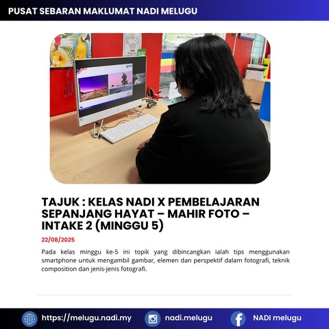23 Ogos 2025 | Aktiviti TerkiniPada 22 Ogos 2025, dua orang peserta dari Pusat Sebaran Maklumat Nasional (NADI) Melugu telah menyertai sesi Kelas NADI Mahir iaitu Mahir Foto yang diadakan menggunakan platform Google Meet.