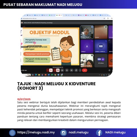 20 Julai 2025 | Aktiviti TerkiniPada 19 Julai 2025, Satu sesi webinar bertajuk telah dijalankan bagi memberi pendedahan awal kepada peserta mengenai dunia keusahawanan. Webinar ini merangkumi topik mengenal pasti kehendak pelanggan, mempelajari teknik promosi yang berkesan serta mengasah minda peserta untuk berfikir seperti seorang usahawan. Melalui sesi ini, peserta diberi panduan tentang cara memahami keperluan pasaran, membina strategi pemasaran yang relevan dan membangunkan kreativiti dalam menguruskan perniagaan.