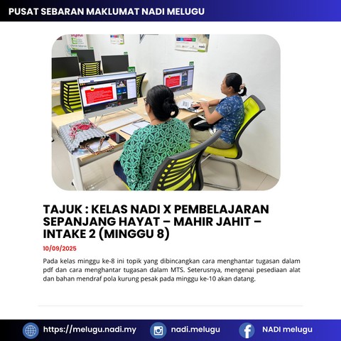 11 September 2025 | Aktiviti TerkiniPada 10 September 2025, dua orang peserta dari Pusat Sebaran Maklumat Nasional (NADI) Melugu telah menyertai sesi Kelas NADI Mahir iaitu Mahir Jahit yang diadakan menggunakan platform Google Meet.