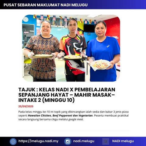 26 September 2025 | Aktiviti TerkiniPada 25 September 2025, tiga orang peserta dari Pusat Sebaran Maklumat Nasional (NADI) Melugu telah menyertai sesi Kelas NADI Mahir iaitu Mahir Masak yang diadakan menggunakan platform Google Meet.