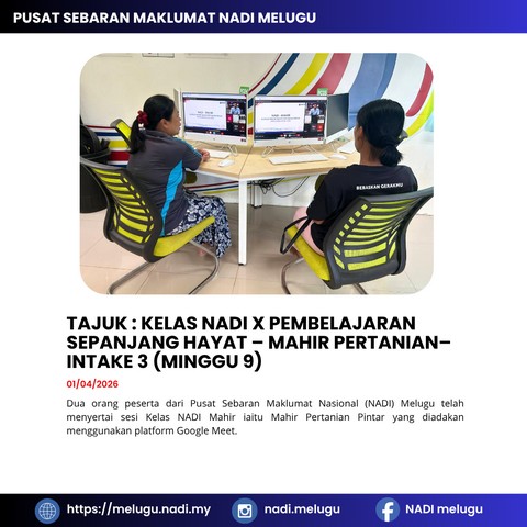 2 April 2026 | Aktiviti TerkiniDua orang peserta dari Pusat Sebaran Maklumat Nasional (NADI) Melugu telah menyertai sesi Kelas NADI Mahir iaitu Mahir Pertanian Pintar yang diadakan menggunakan platform Google Meet.