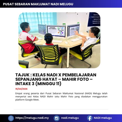 16 April 2026 | Aktiviti TerkiniEmpat orang peserta dari Pusat Sebaran Maklumat Nasional (NADI) Melugu telah menyertai sesi Kelas NADI Mahir iaitu Mahir Foto yang diadakan menggunakan platform Google Meet.
