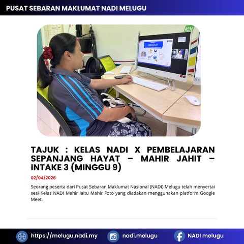 3 April 2026 | Aktiviti TerkiniSeorang peserta dari Pusat Sebaran Maklumat Nasional (NADI) Melugu telah menyertai sesi Kelas NADI Mahir iaitu Mahir Foto yang diadakan menggunakan platform Google Meet.