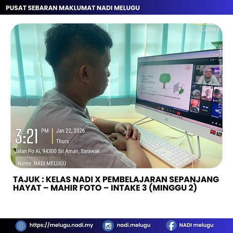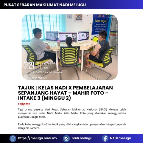23 Januari 2026 | Aktiviti TerkiniTiga orang peserta dari Pusat Sebaran Maklumat Nasional (NADI) Melugu telah menyertai sesi Kelas NADI Mahir iaitu Mahir Foto yang diadakan menggunakan platform Google Meet.