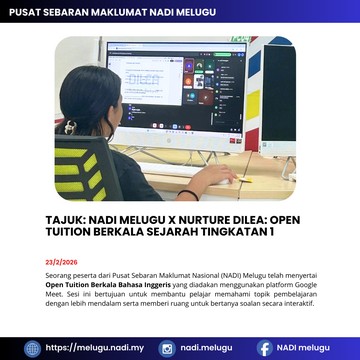 23 Februari 2026 | Aktiviti TerkiniSeorang peserta dari Pusat Sebaran Maklumat Nasional (NADI) Melugu telah menyertai Open Tuition Berkala Bahasa Sejarah yang diadakan menggunakan platform Google Meet. Sesi ini bertujuan untuk membantu pelajar memahami topik pembelajaran dengan lebih mendalam serta memberi ruang untuk bertanya soalan secara interaktif.