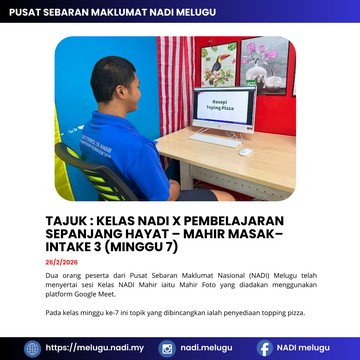 Dua orang peserta dari Pusat Sebaran Maklumat Nasional (NADI) Melugu telah menyertai sesi Kelas NADI Mahir iaitu Mahir Foto yang diadakan menggunakan platform Google Meet.