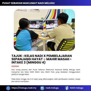 5 Februari 2026 | Aktiviti TerkiniDua orang peserta dari Pusat Sebaran Maklumat Nasional (NADI) Melugu telah menyertai sesi Kelas NADI Mahir iaitu Mahir Foto yang diadakan menggunakan platform Google Meet.