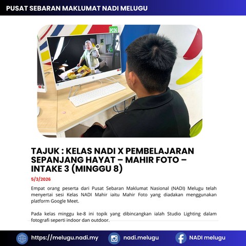 6 Mac 2026 | Aktiviti TerkiniEmpat orang peserta dari Pusat Sebaran Maklumat Nasional (NADI) Melugu telah menyertai sesi Kelas NADI Mahir iaitu Mahir Foto yang diadakan menggunakan platform Google Meet.
