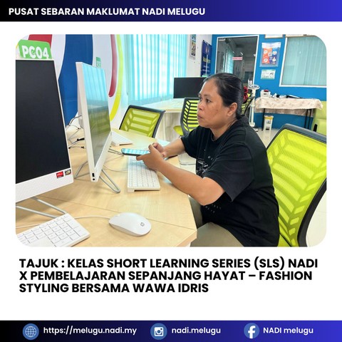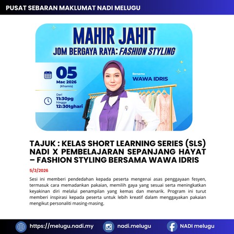 Satu sesi Kelas Short Learning Series (SLS) Fashion Styling bersama Wawa Idris telah berjaya diadakan di Pusat Sebaran Maklumat Nasional (NADI) Melugu. Sesi ini memberi pendedahan kepada peserta mengenai asas penggayaan fesyen, termasuk cara memadankan pakaian, memilih gaya yang sesuai serta meningkatkan keyakinan diri melalui penampilan yang kemas dan menarik. Program ini turut memberi inspirasi kepada peserta untuk lebih kreatif dalam menggayakan pakaian mengikut personaliti masing-masing.