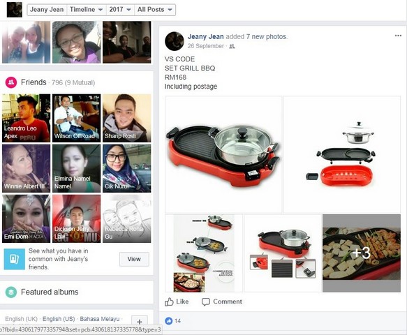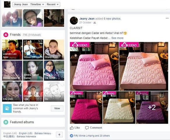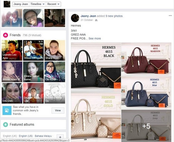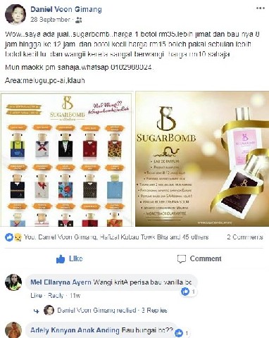 Pn. Jenny anak Dom berminat dalam penjualan secara online yang menggunakan facebook sebagai platform. Antara barangan yang dijual adalah seperti beg tangan, perkakasan rumah, barangan eleltronik dan lain-lain lagi.