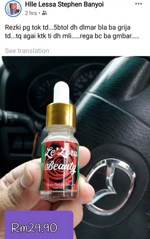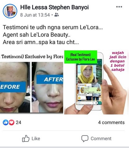 Pn. Hellesa anak Stephen Banyoi berminat dalam penjualan produk secara online dan merupakan ejen dropship bagi produk kecantikkan yang dihasilkan oleh usahawan tempatan iaitu Le’Lora Beauty. Produk kecantikkan yang diiklankan oleh beliau dalam media sosial telah mendapat permintaan yang memberangsangkan daripada penduduk sekitar. Untuk maklumat lanjut, beliau boleh dihubungi ditalian 0111-4314088 atau Facebook : Hlle Lessa Stephen Banyoi.
